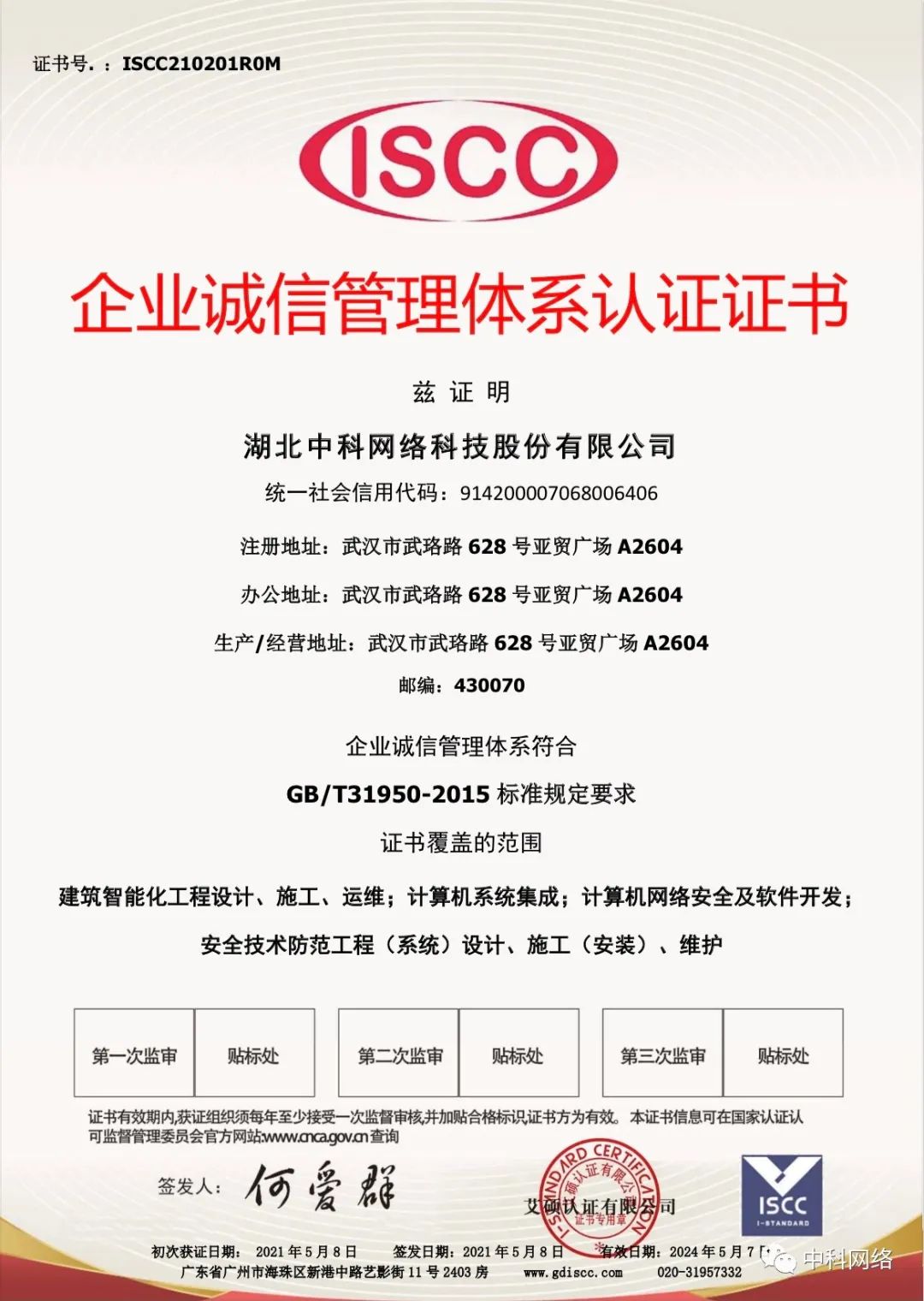 中科网络荣获企业诚信管理体系认证及售后服务认证证书