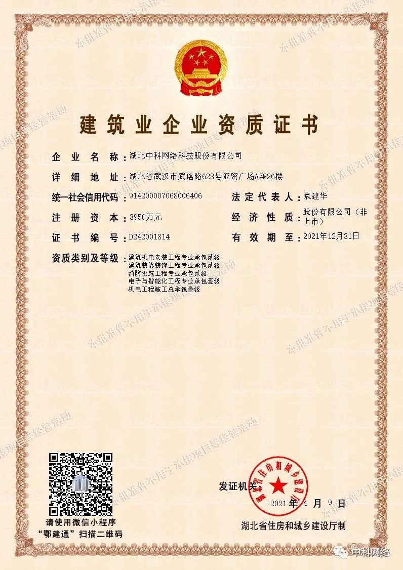 喜讯:中科网络成功获得“机电工程施工总承包叁级”证书